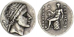 Diameter: The utilisation of dies from the larger diameter gold stater necessitates a larger than usual diameter silver drachm flan to fully accommodate the images. Lot 4166 is 17 mm in diameter, in contrast to the more usual 14-15 mm of contemporaneous Seleucid drachms issued from Ai Khanoum. By way of comparison SC 618/ESM 710, the type to which this coin was attributed in the description of Lot 4166 is 14-15 mm in diameter based on the illustrations of the coin in Houghton and Lorber (Seleucid Coins) and Newell (Eastern Seleucid Mints).
